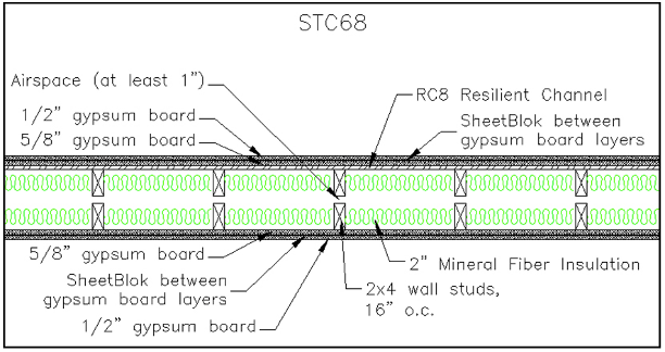 - A double-stud or staggered-stud wall with Airspace, Mineral Fiber or EcoCell insulation, SheetBlok and RC-8 Resilient Channel: STC ~68+
